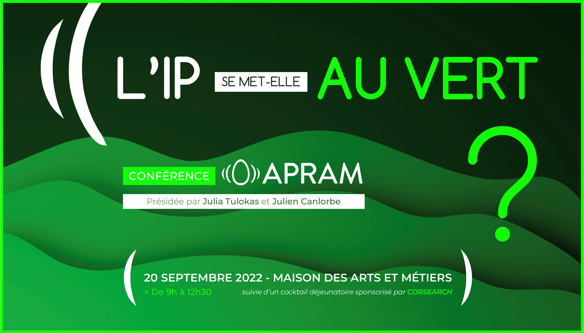 Mardi 20 Septembre de 9h à 12h30 : Conférence APRAM à la Maison des Arts et Métiers (9 bis avenue d’Iéna, Paris 16ème) Sujet : « l’IP se met-elle au vert ? » présidée par Julia Tulokas et Julien Canlorbe.